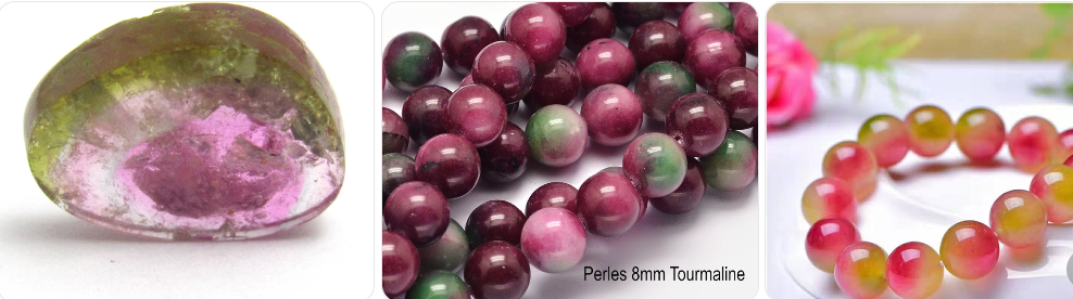 Voici un exemple de la tourmaline pastèque, la vraie à gauche et les fausses à droite ! Cette pierre est très rare et onéreuse donc c'est tellement tentant de vouloir la reproduire !