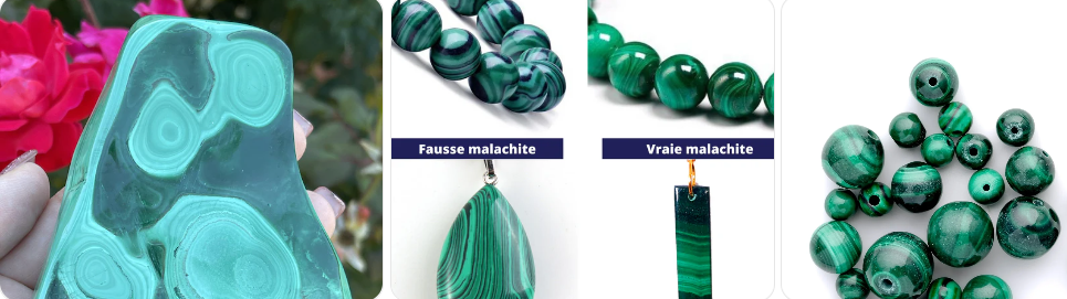 La malachite naturelle a des motifs irréguliers. Si le dessin semble imprimé → méfiance.