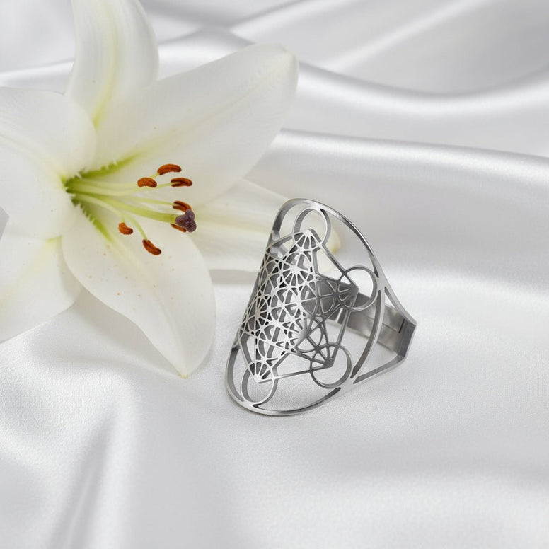 Cette bague en acier inoxydable argenté, ornée du symbole sacré de Métatron, séduit par son élégance ajustable et sa douce lumière mystique.