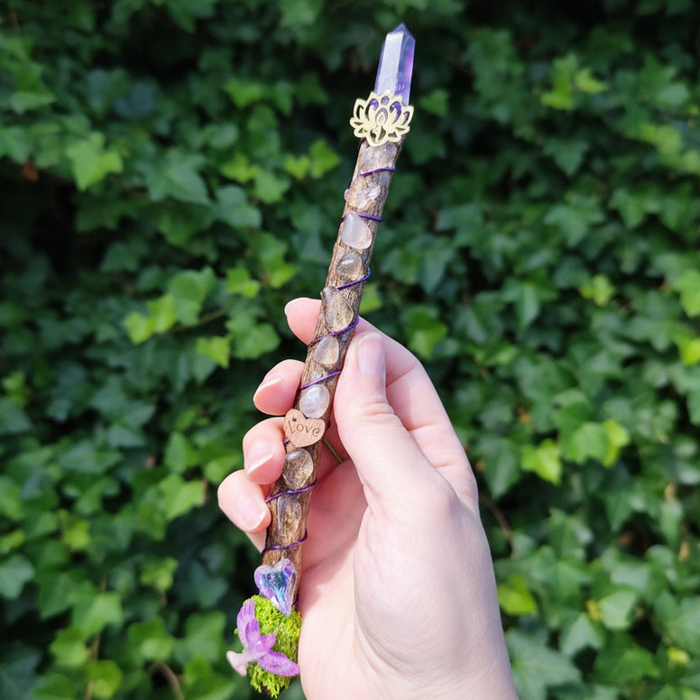 Cette baguette soutient les passages d’âme, les périodes de transition, les rituels de guérison et les élans créateurs. Elle t’accompagne avec douceur sur le chemin de l’évolution intérieure, en te reconnectant à la magie naturelle et au souffle du vivant.