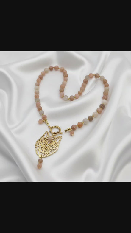 Collier de perles en Pierre de Lune Multicolore, Loup L’Instinct Sacré