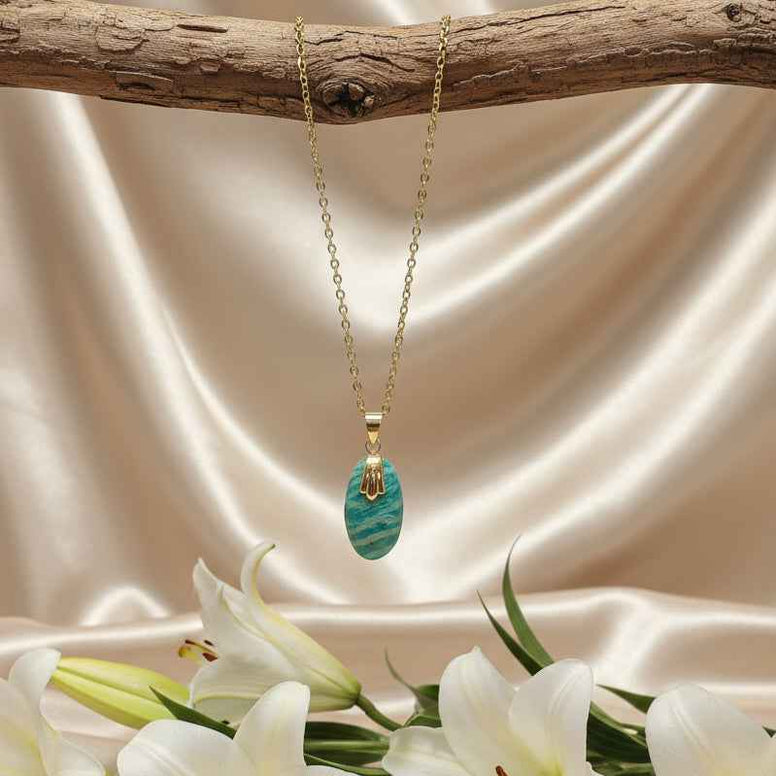 Ce pendentif ovale en amazonite naturelle, monté à la main sur une chaîne fine dorée en acier inoxydable de 45 cm, incarne l’audace de l’harmonie.