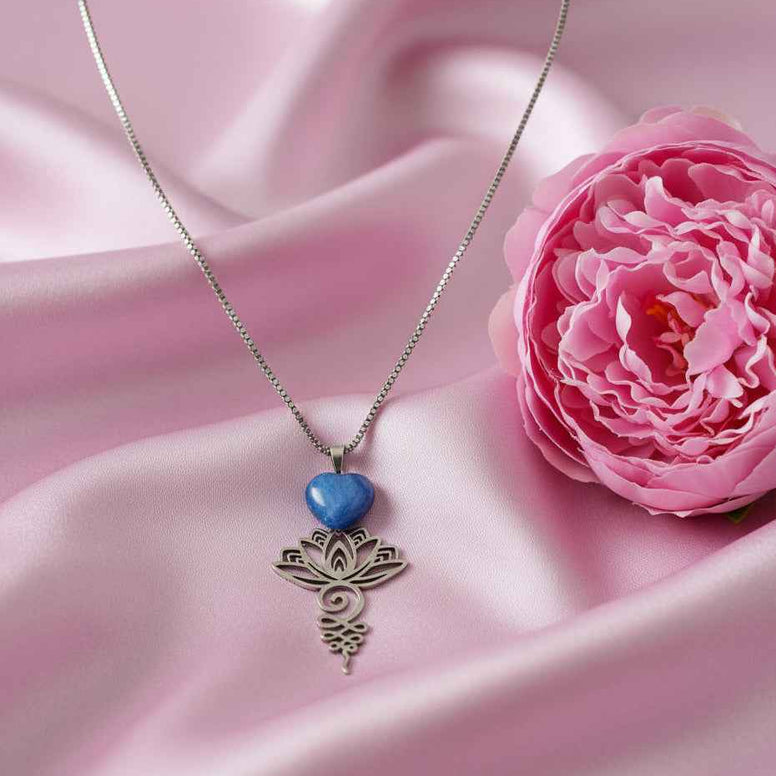 Succombe à la beauté de ce collier unalome argenté et sa pierre naturelle bleuté de Cyanite extra.