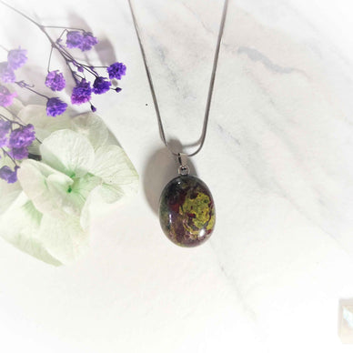 Ce pendentif de 2cm en jaspe sanguin naturel est monté sur une bélière sur chaine en acier inoxydable de 45 cm avec perle de fin.