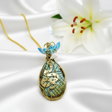 Sautoir doré et labradorite, sertie de cuivre, serpent et phénix.