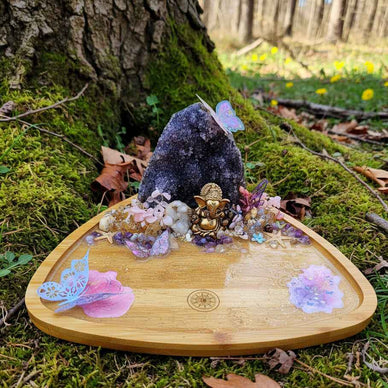 -Une symphonie de matière et d’intentions subtile avec ce plateau en bambou décoré de Cristaux naturels, géode d'améthyste de +1,111kg, géode de quartz, pépites d'améthyste et de quartz.