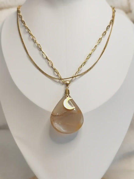 🌓 Le collier est composé d’un double rang doré (40 cm), en acier inoxydable hypoallergénique, qui enlace délicatement la gorge, avec un fermoir fluide et élégant. Il porte, en son centre, un pendentif exceptionnel de 35 mm en pierre de Lune extra.