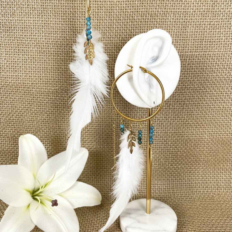 Boucles d'oreilles Enchantée, apatite, plume blanche, dorée