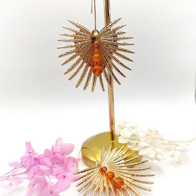 Trois perles rondes suspendues de cornaline diffusent leur énergie chaleureuse, connectée au chakra sacré : elles réveillent la joie, la vitalité et la créativité. C’est la pierre des projets qui prennent vie et de l’élan intérieur qui donne envie de mordre la vie à pleines dents.