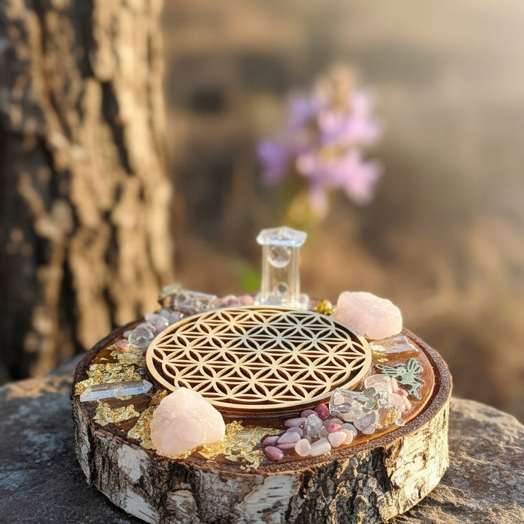 -Sur une fleur de vie avec un quartz au centre 🌸✨.